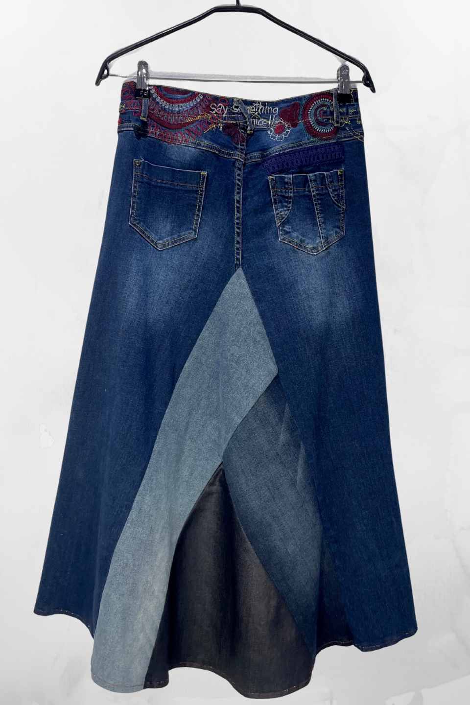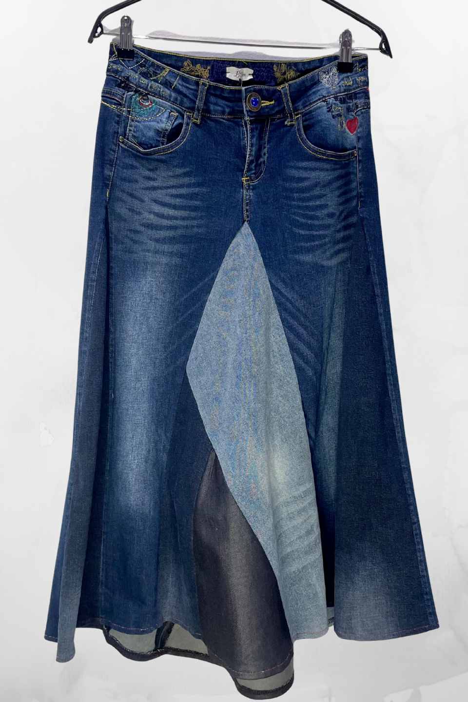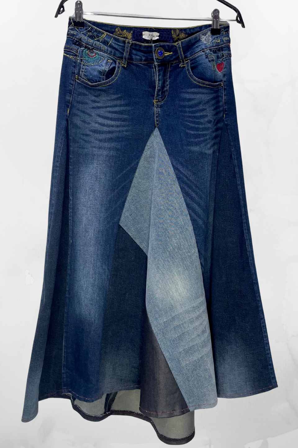 Asimetrična suknja od recikliranog trapera Korina – unikatni ručni rad