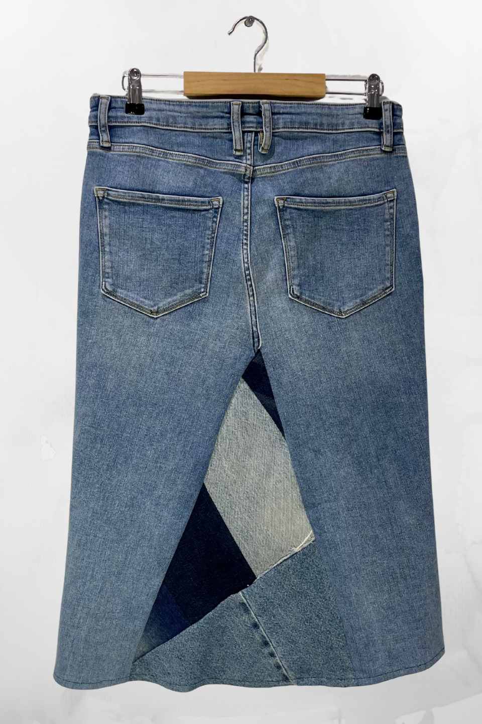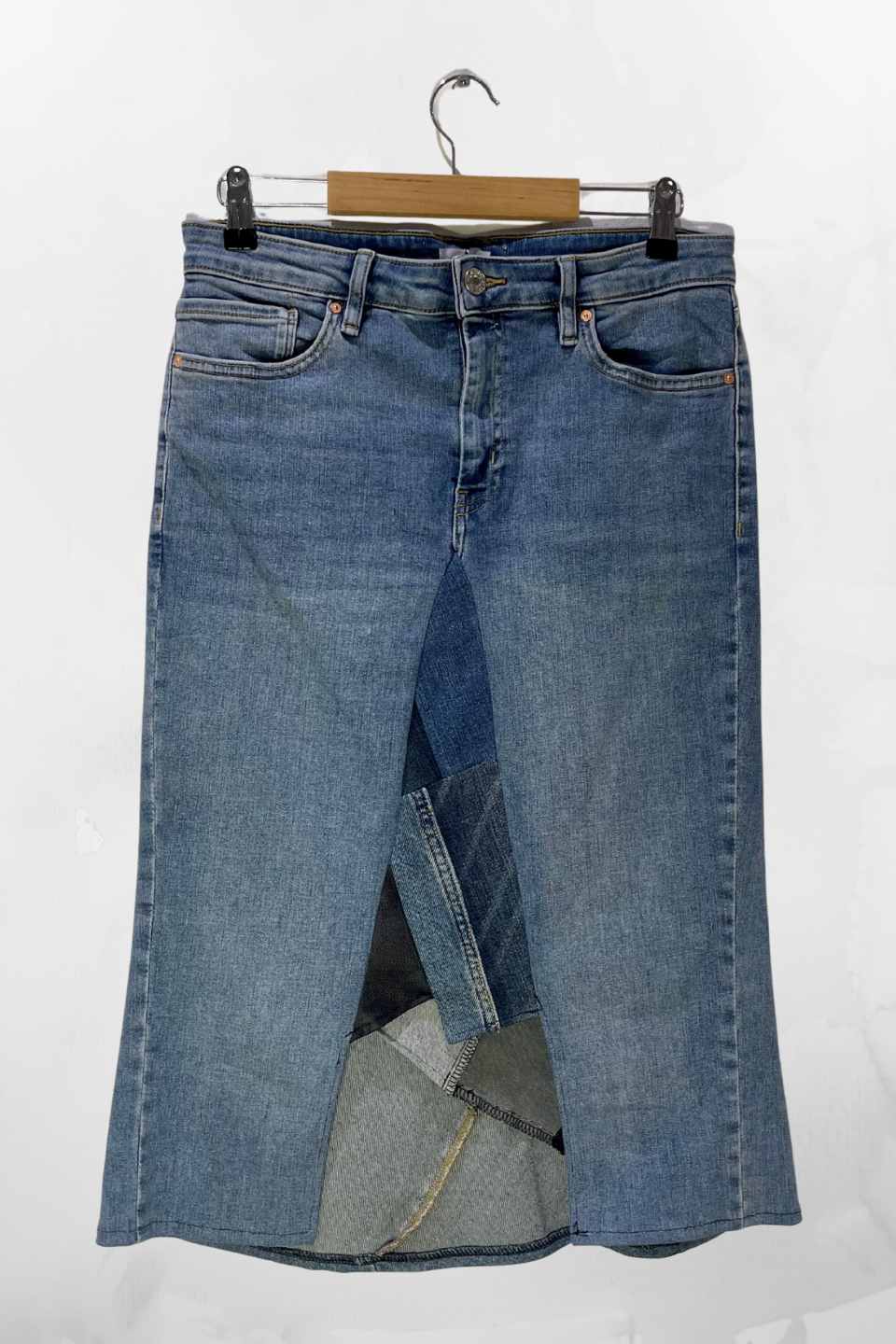 Ova suknja izrađena je od recikliranih traper hlača, što je čini potpuno jedinstvenom – nijedna nije ista. Klasičan kroj s prepoznatljivim detaljima trapera lako se uklapa u svaki stil, dok patchwork umetci daju poseban karakter.
